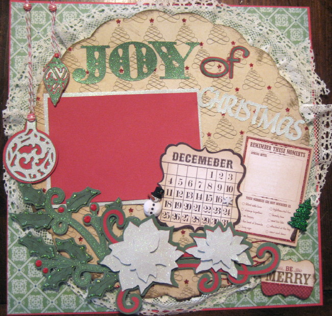 I added lace, baker's twine, brads, snowman and tree button, glitter paper for the poinsietta's, and a snowflake button for the date on the calendar....used twinkle glitter on the holly berry and added some red bubble paint. Hope you enjoy and I am wishing everyone a Merry Christmas if I don't make it back here before then.