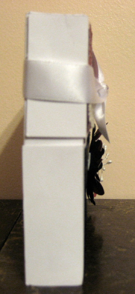 For that one I used Cuttlebug argyle folder , used finger nail file to sand it. Added white ribbon and lace, also used sizzix flower folder and crumpled the flowers. added some more lace to middle and pearl sprays, and 2 pearl pins...but then I found out the card did not fit...so I modified...which those are pics 3 - 6....the last pic is of the card and box together...I am pretty sure she will love it.